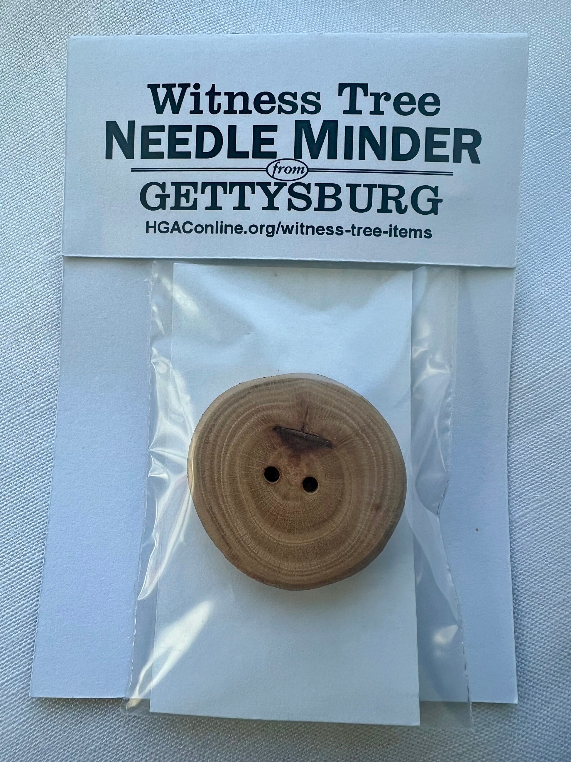 Just like the ever-popular Witness Buttons, these needle minders are hand crafted from fallen branches of the tree (also known as Buttonwood Tree) that saw the great battle of Gettysburg and Lincoln passing to deliver the Gettysburg Address.